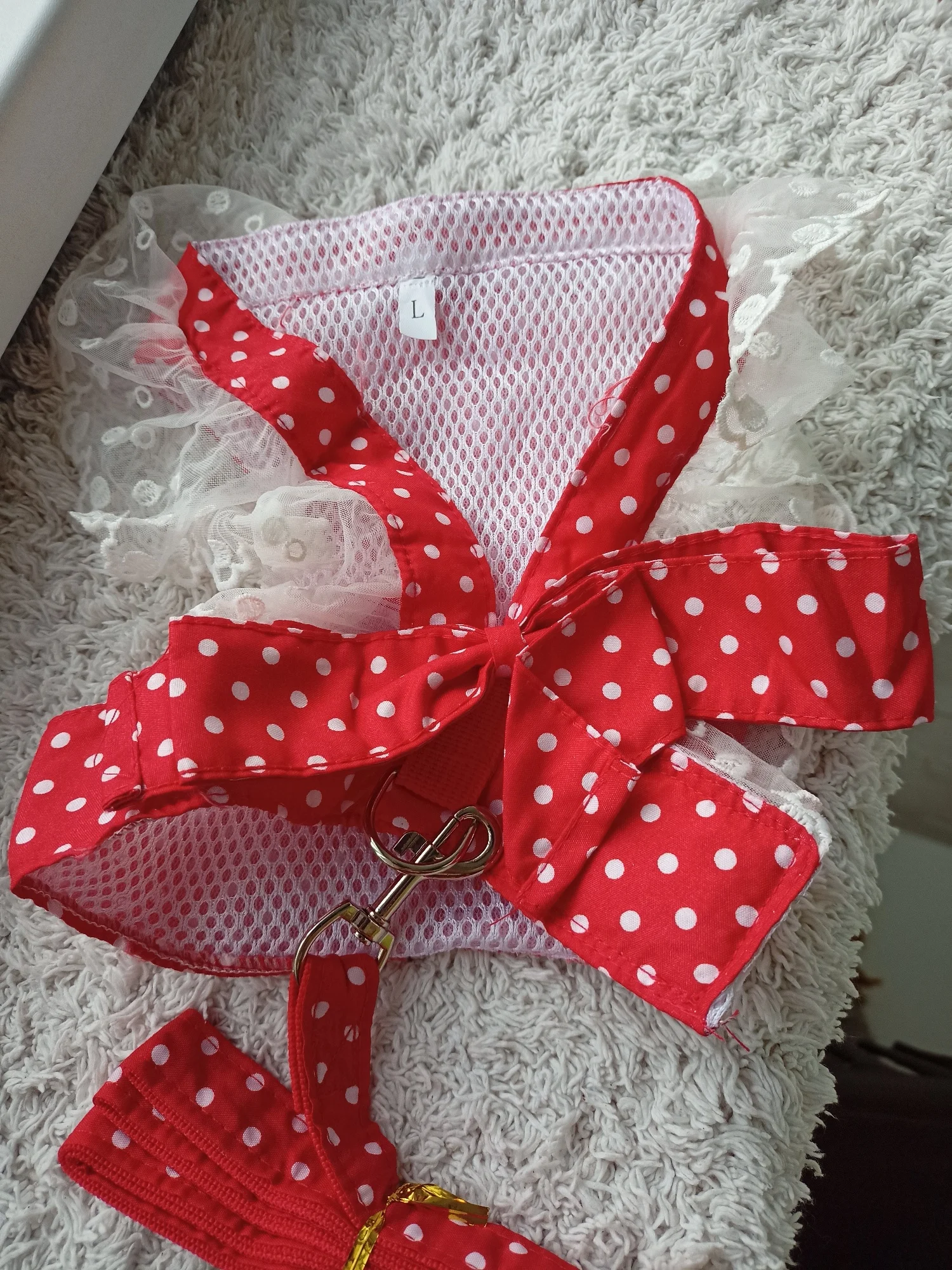 Make your furry friend the star of every walk with this adorable red lace dog harness and leash set. Designed with a charming bow knot and delicate lace trim, this stylish pet harness is perfect for small and medium dog breeds such as Pomeranians, Toy Poodles, Yorkies, Chihuahuas, Maltese, and more.
